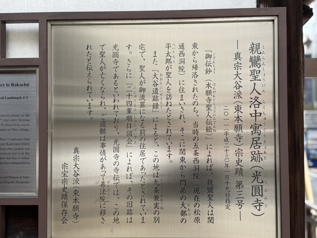 光円寺の地は親鸞が流刑になる前、そして京都に戻ってきたときの居宅があったとされています。
